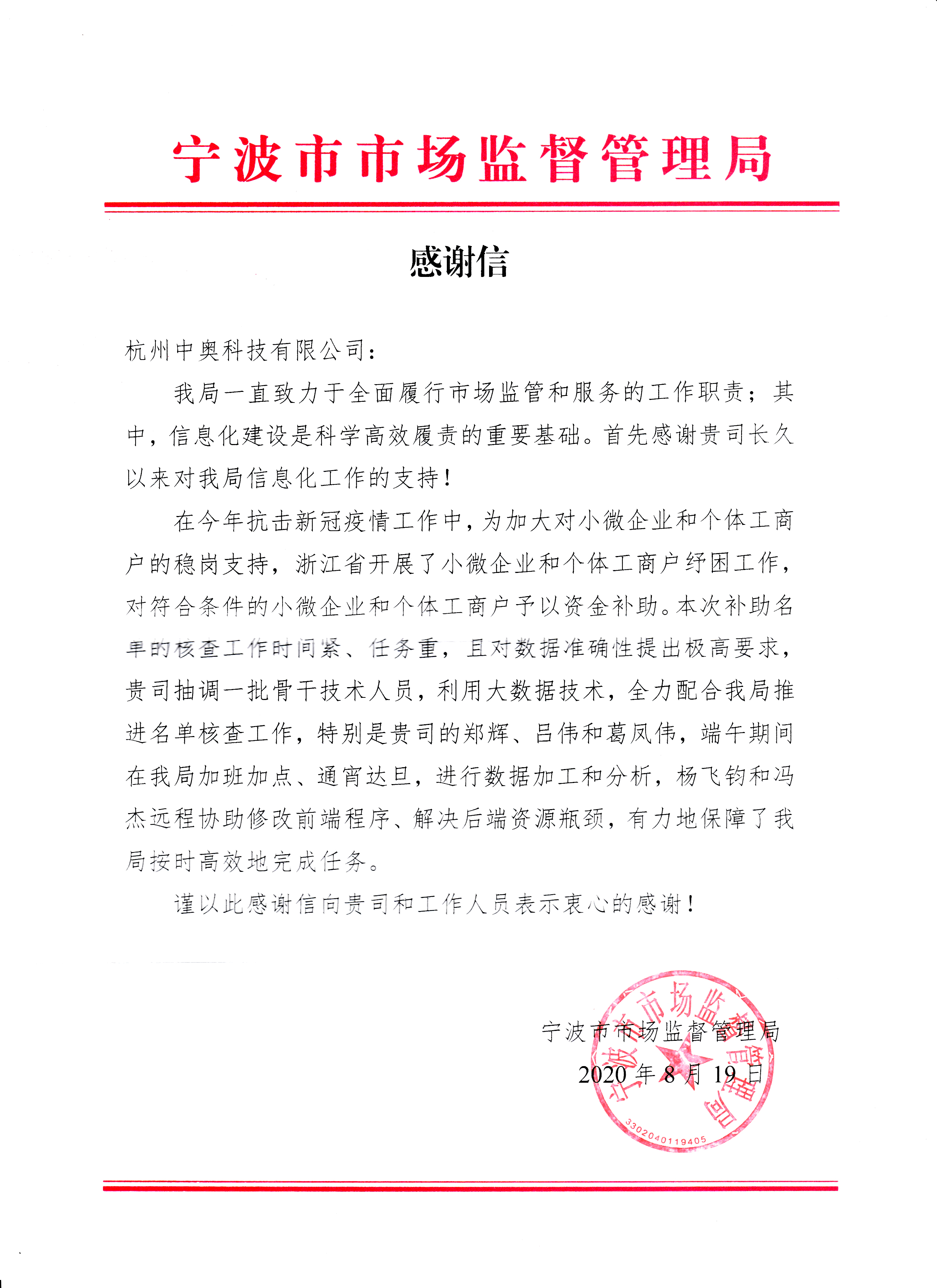 3天內完成對1136258 家小微企業和個體戶數據的治理工作,建設紓困標簽2大類39小類,精準分析出紓困名單13萬多家……近日,寧波市市場監管局對中奧科技團隊利用大數據技術,全力配合寧波市市場監管管理局開展小微企業和個體工商戶紓困工作及長久以來對市場監督管理局信息化工作的支持表示感謝!