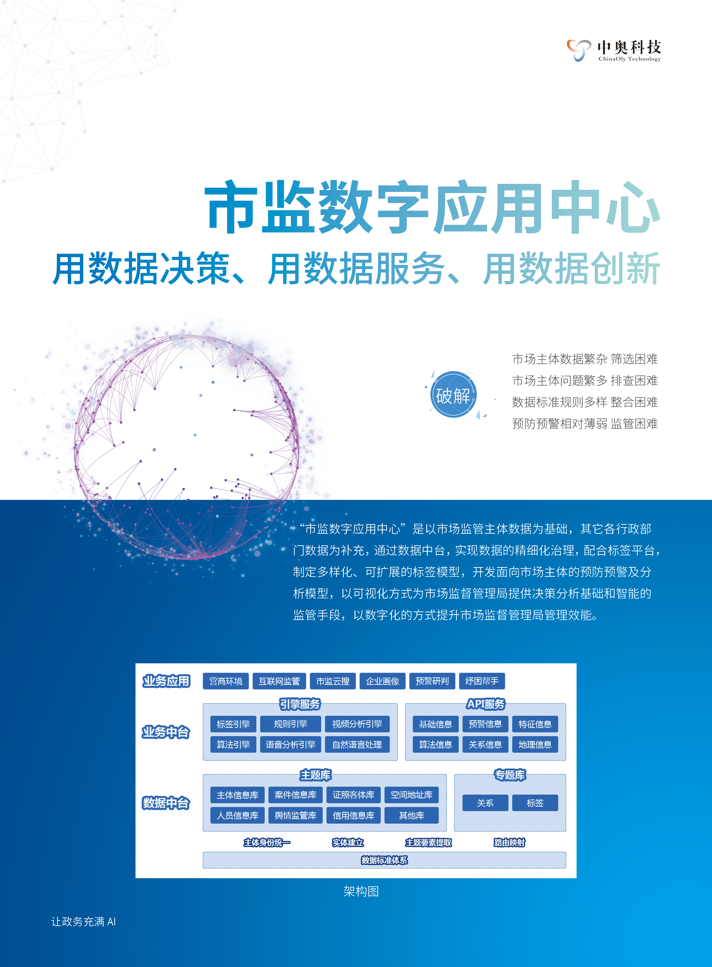 中奧“市監數字應用中心”是以市場監管主體數據為基礎,其它各行政部門數據為補充,通過數據中臺,實現數據的精細化治理,配合標簽平臺,制定多樣化、可擴展的標簽模型,開發面向市場主體的預防預警及分析模型,以可視化方式為市場監督管理局提供決策分析基礎和智能的監管手段,以數字化的方式提升市場監督管理局管理效能。