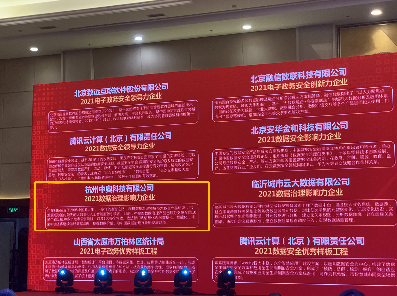 2021年9月23-24日,由中國信息協(xié)會主辦,信息化觀察網(wǎng)、中國信息協(xié)會傳媒中心、國潤互聯(lián)信息技術(shù)研究院共同承辦的“2021第三屆中國電子政務(wù)安全大會”在北京隆重召開,大會重點圍繞“電子政務(wù)安全發(fā)展與創(chuàng)新、政務(wù)數(shù)據(jù)公開與共享、數(shù)據(jù)治理”等議題進行分享、交流。中奧科技應(yīng)邀參與此次大會,共推中國電子政務(wù)安全發(fā)展,同時榮獲“2021數(shù)據(jù)治理影響力企業(yè)”獎。