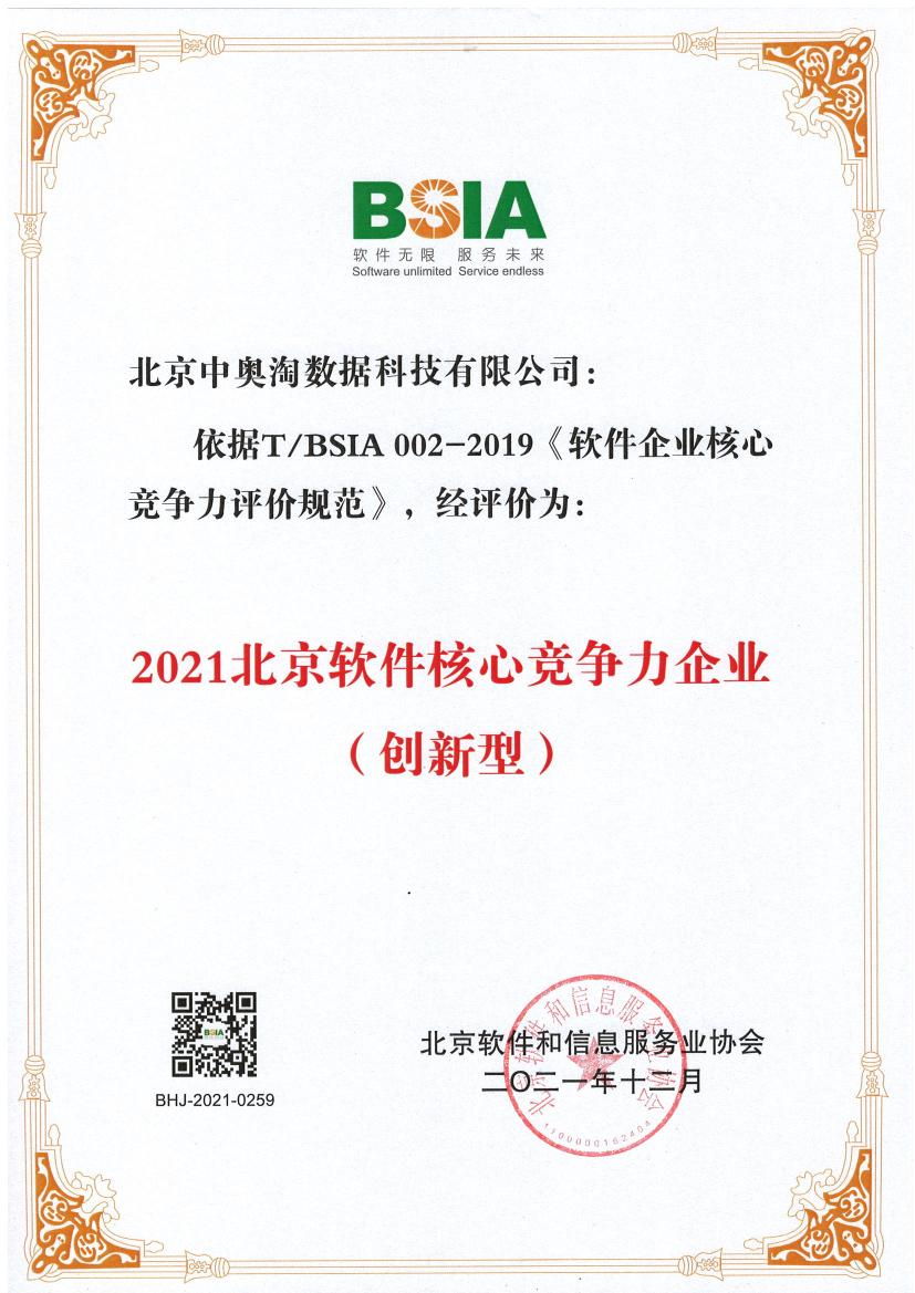 北京中奧獲評“2021北京軟件核心競爭力企業(yè)(創(chuàng)新型)”